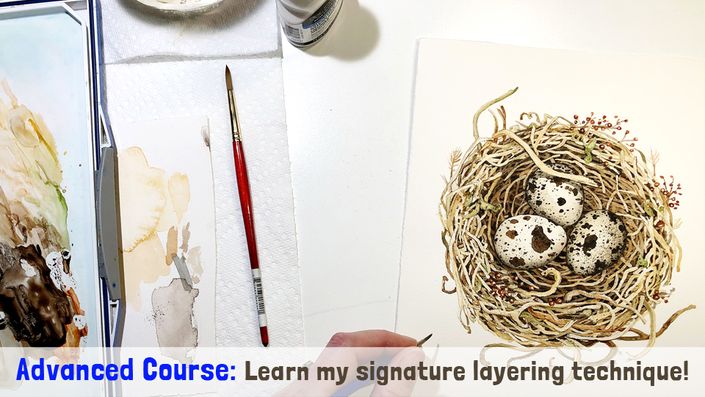 👉 My signature technique for layering masking fluid and watercolors to make a nest painting.